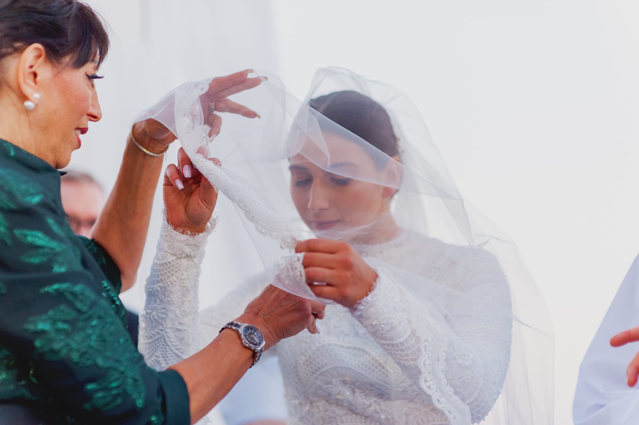 Badeken: The groom goes to see the bride, accompanied by the male guests, and places a veil over her face. This symbolizes his commitment to love and protect her.