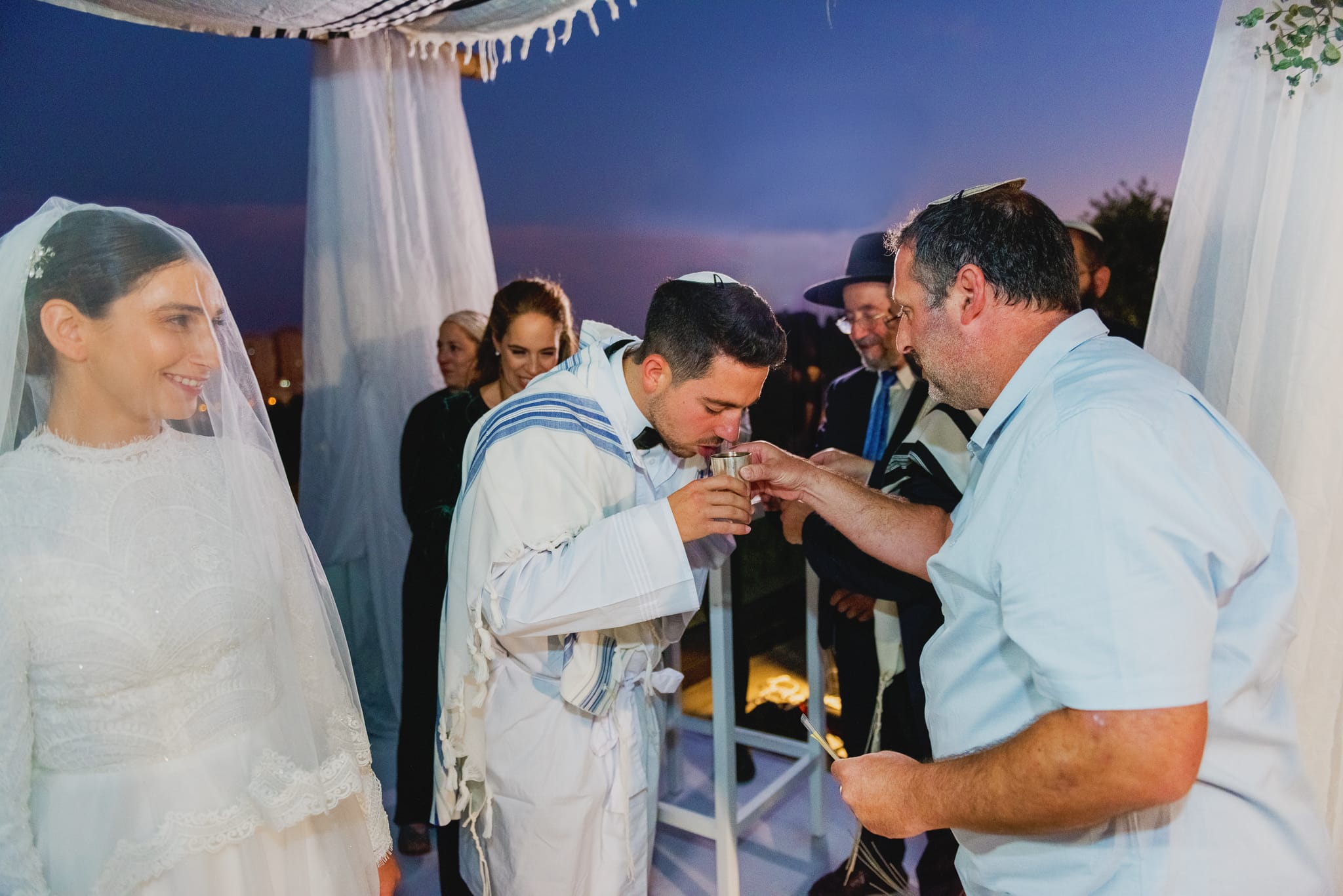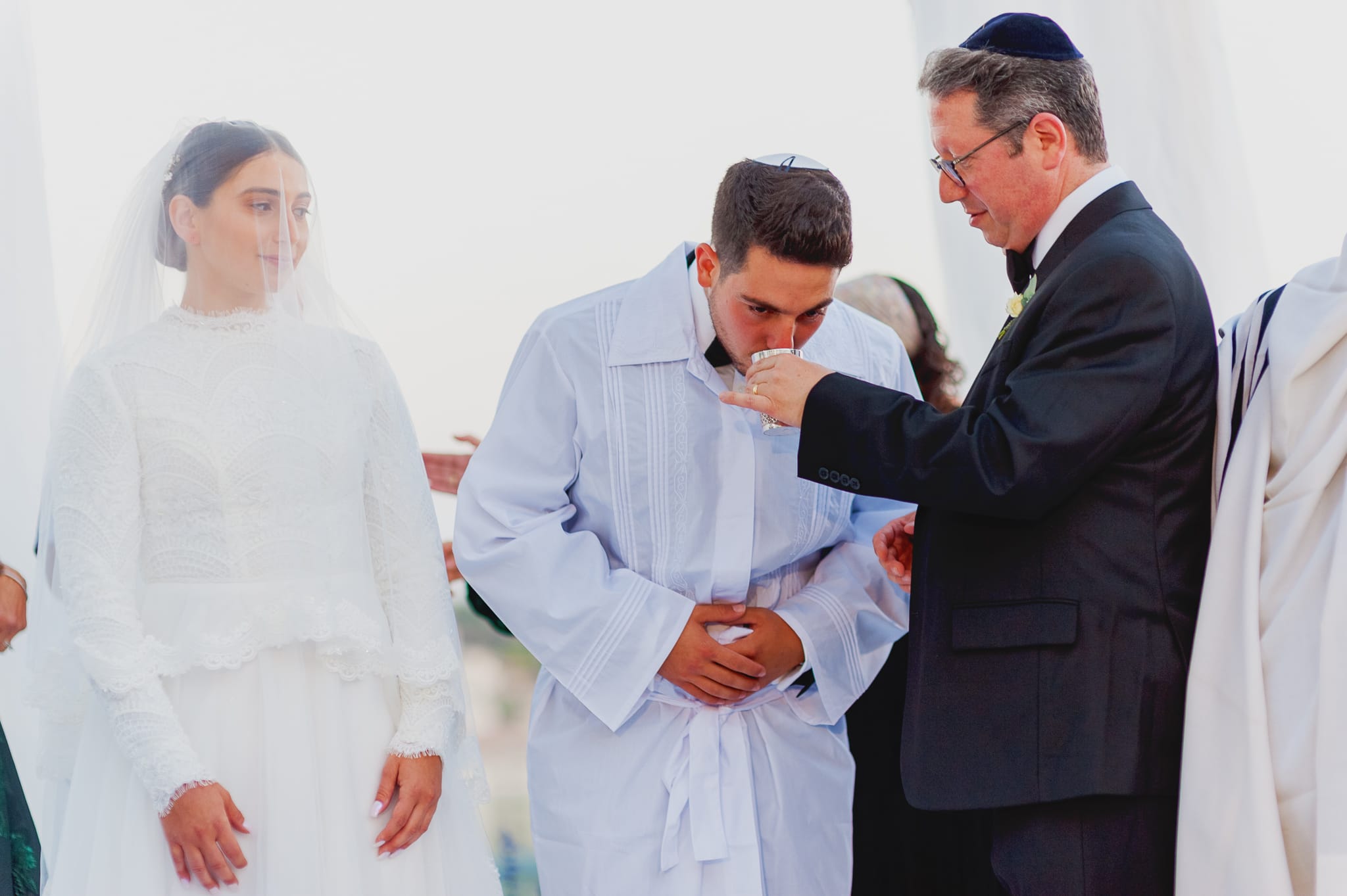 Kiddushin: The ceremony includes the Kiddushin, the betrothal of the bride to the groom. The groom recites a blessing over a cup of wine, and then the couple drinks from it.