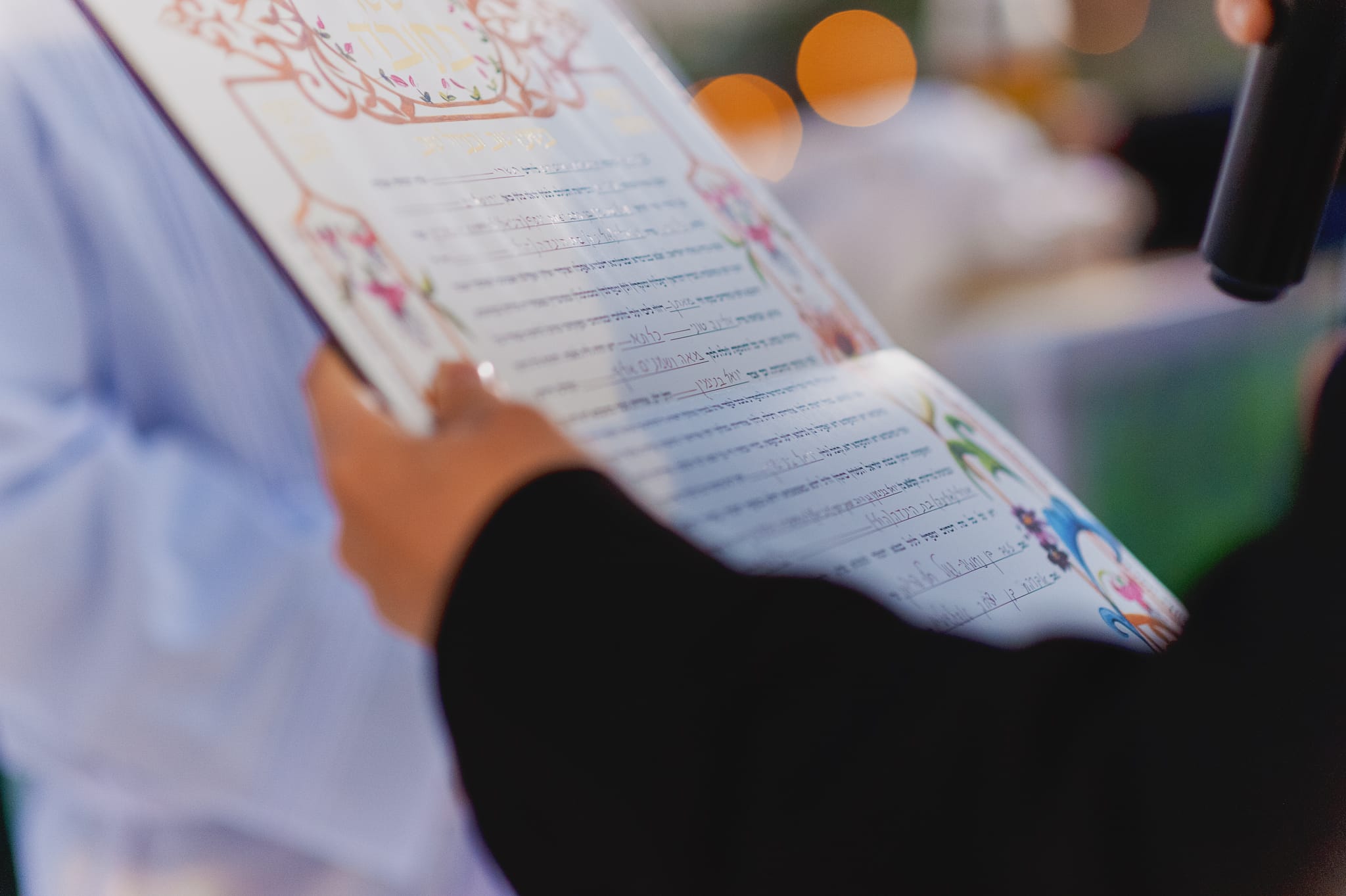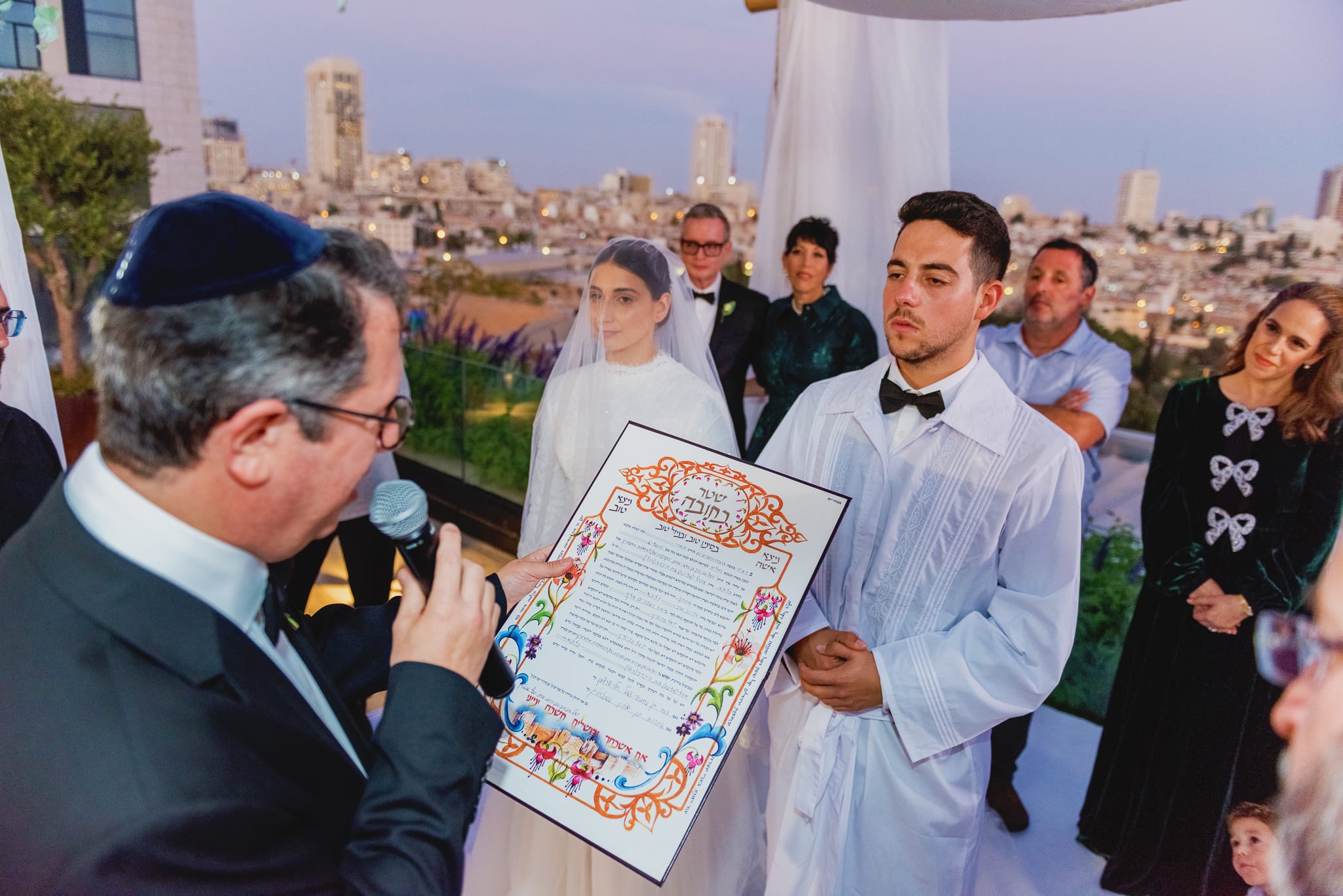 Ketubah: Before the wedding ceremony, the Ketubah, a Jewish marriage contract, is signed by the groom and two witnesses. The document outlines the groom’s responsibilities to his wife, including financial support and providing for her needs.